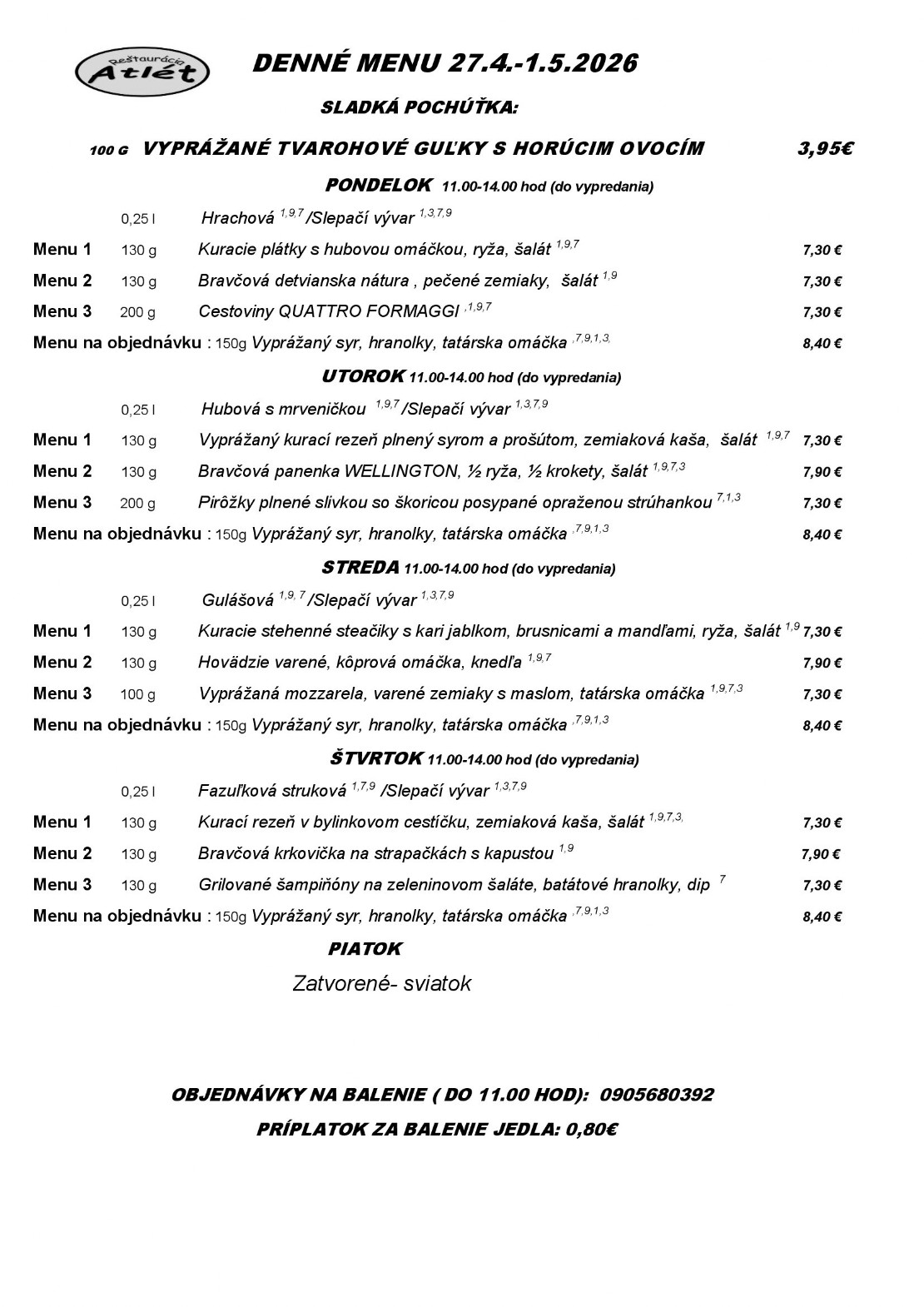 Týždenné menu - Reštaurácia Atlét